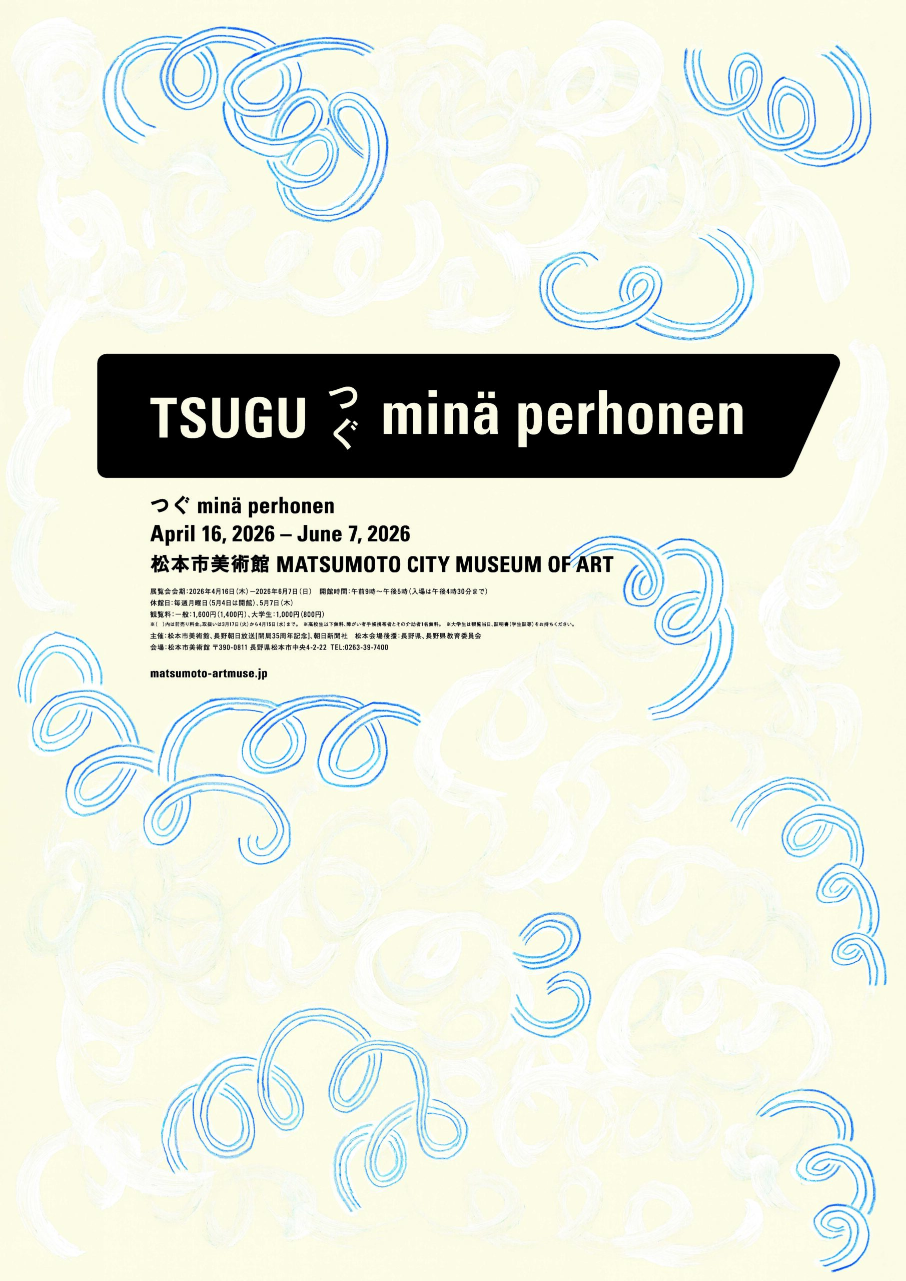 企画展 次回開催 つぐ minä perhonen 2026年4月16日(木) – 2026年6月7日(日) Thursday April 16, 2026 – Sunday, June 7, 2026 2階 企画展示室 アートワーク:皆川 明《クルクル うねうね》 展覧会チラシを見る 「つぐ」という言葉でミナ ペルホネンの活動をひもとく展覧会 2025年に創設30周年を迎えたファッション・テキスタイルブランド、ミナ ペルホネン。 ミナ ペルホネンのものづくりは、 デザイナーの手作業によって生み出されるテキスタイルの図案からはじまります。そのデザインは、熟練の技術者でもある職人たちとの対話と試行錯誤、工夫を重ねることによって、一枚の布、布から服、そして様々なインテリアプロダクトへと実を結んできました。本展では、100 年後も存続するブランドとしてのあり方を模索しながら独自のプロダクトを生み出してきたその活動を、貴重な原画やテキスタイルにくわえ、刺繍、織、プリント工場の様子などを通してご紹介します。流行に左右されず、普遍的な価値を追求するミナ ペルホネンのものづくりのありかたに触れられる展覧会です。 展覧会公式サイトはこちら 【minä perhonen (ミナ ペルホネン)】 デザイナー・皆川 明(1967-)が1995年に設立した「minä」を前身とするブランド。流行に左右されず、長年着用できる普遍的な価値を持つ「特別な日常服」をコンセプトとし、日本各地の生地産地と深い関係性をつなぎながら、オリジナルの生地からプロダクトを生み出す独自のものづくりを続けている。 「せめて100年つづくブランド」という思いでファッションからスタートした活動は、次第にインテリアや食器をはじめ食や宿など、生活全般やホスピタリティを基軸とした活動へと広がっている。 “surplus” 2003-04→a/w“surplus” 2003-04→a/w “one day” 2018-19→a/w“one day” 2018-19→a/w “pot-au-feu” 2015-16→a/w“pot-au-feu” 2015-16→a/w “tarte” 2007-08→a/w“tarte” 2007-08→a/w “swing camellia” 2022-23→a/w 原画 Photo : sono (mame)“swing camellia” 2022-23→a/w 原画 Photo : sono (mame) “sea sky” 2025-26→a/w Photo : Keita Goto(W)“sea sky” 2025-26→a/w Photo : Keita Goto(W) “alive” 2011-12→a/w 原画 Photo : Shinichi Yamasaki“alive” 2011-12→a/w 原画 Photo : Shinichi Yamasaki “swing camellia” 2022-23→a/w Photo : Hua Wang“swing camellia” 2022-23→a/w Photo : Hua Wang “kivi” 2025-26→a/w Photo : Keita Goto(W)“kivi” 2025-26→a/w Photo : Keita Goto(W) 刺繍工場での補修作業 手元風景 Photo : Yayoi Arimoto刺繍工場での補修作業 手元風景 Photo : Yayoi Arimoto “forest parade” 2005→s/s 原画と刺繍パーツ Photo : sono (mame)“forest parade” 2005→s/s 原画と刺繍パーツ Photo : sono (mame) 開催情報 会期 2026年4月16日(木) – 2026年6月7日(日) Thursday April 16, 2026 – Sunday, June 7, 2026 開館時間 9:00~17:00(入場は16:30まで) 休館日 月曜日(5月4日は開館)、5月7日(木)は休館 会場 2階 企画展示室 主催 松本市美術館、長野朝日放送[開局35周年記念]、朝日新聞社 松本会場後援 長野県、長野県教育委員会 観覧料 一 般 大学生 高校生以下 当 日 券 1,600円 1,000円 無料 前 売 券 1,400円 800円 前売券の取扱いは3月17日(火)から4月15日(水)まで 高校生以下無料、障がい者手帳携帯者とその介助者1名無料 大学生は、観覧当日、証明書(学生証等)をお持ちください ■本展観覧券では3階のコレクション展示・記念室展示はご覧いただけません。 ■プレイガイド 松本市美術館 公式オンラインチケット(e-tix) 関連イベント 4月16日(木) Thursday, April 16 開催予定 皆川 明・田中景子によるギャラリートーク つぐ minä perhonen 展 4月25日(土) Saturday , April 25 開催予定 ワークショップ「テキスタイルをデザインしよう」 つぐ minä perhonen 展 5月9日(土) Saturday , May 9 開催予定 皆川 明・田中景子 トークイベント つぐ minä perhonen 展