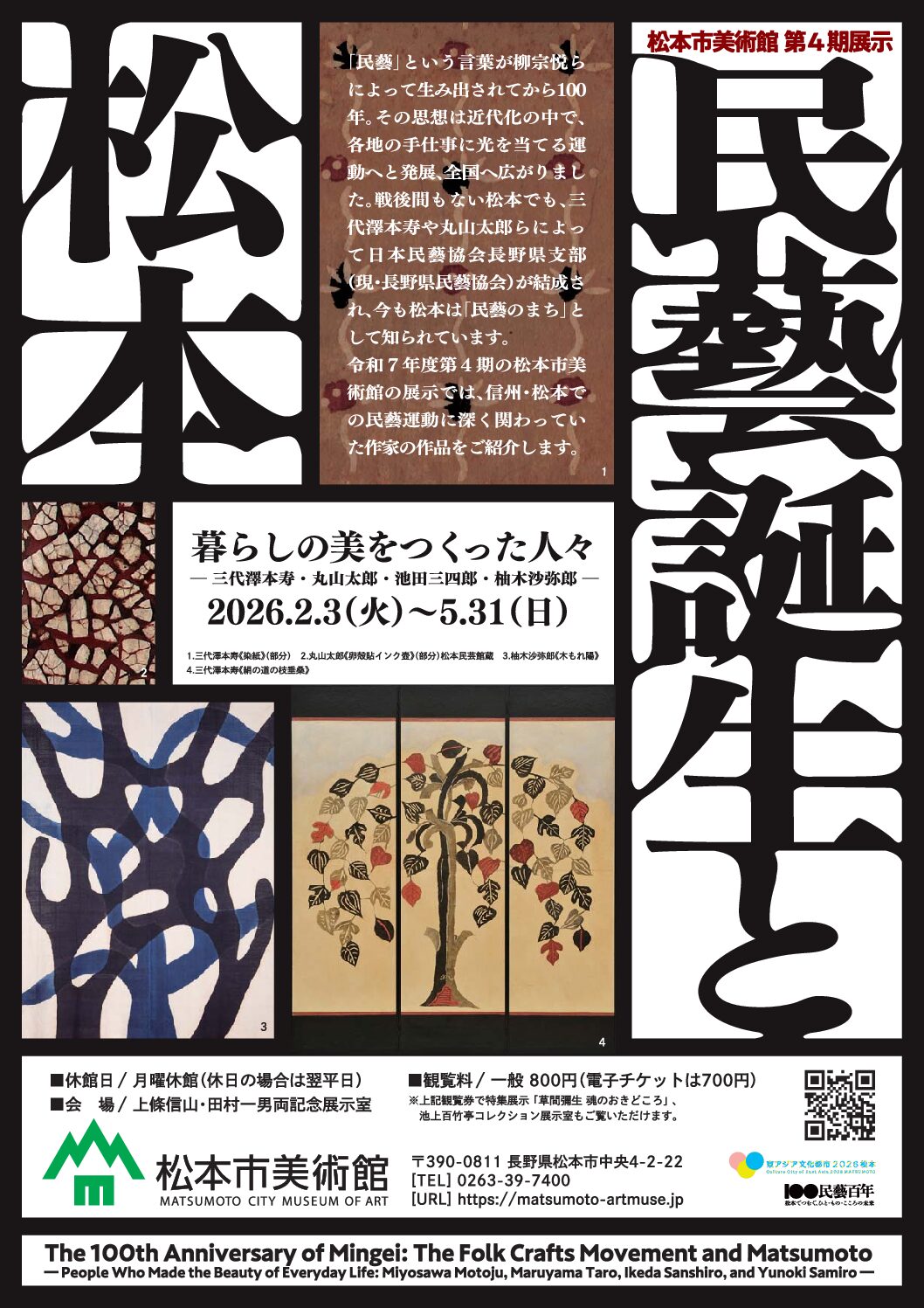 コレクション展示 次回開催 第4期コレクション展示 民藝誕生と松本 暮らしの美をつくった人々―三代澤本寿・丸山太郎・ 池田三四郎・柚木沙弥郎― 2026年2月3日(火) – 2026年5月31日(日) Tuesday, February 3, 2026 – Sunday, 31 May, 2026 上條信山記念展示室・田村一男記念展示室 「民藝」という言葉が柳宗悦らによって生み出されてから100年。その思想は近代化の中で、各地の手仕事に光を当てる運動へと発展、全国へ広がりました。戦後間もない松本でも、三代澤本寿や丸山太郎らによって日本民藝協会長野県支部(現・長野県民藝協会)が結成され、今も松本は「民藝のまち」として知られています。 令和7年度第4期の松本市美術館の展示では、信州松本での民藝運動に深く関わっていた作家の作品をご紹介します。 柳宗悦 《茶偈》昭和期柳宗悦 《茶偈》昭和期 三代澤本寿 《絹の道の枝垂桑》1992年三代澤本寿 《絹の道の枝垂桑》1992年 三代澤本寿 装丁、丸山太郎 著 『河童の妙薬』1948年 個人蔵三代澤本寿 装丁、丸山太郎 著 『河童の妙薬』1948年 個人蔵 丸山太郎 《卵殻貼茶道具箱》1965年 松本民芸館蔵丸山太郎 《卵殻貼茶道具箱》1965年 松本民芸館蔵
