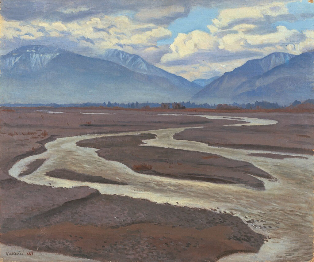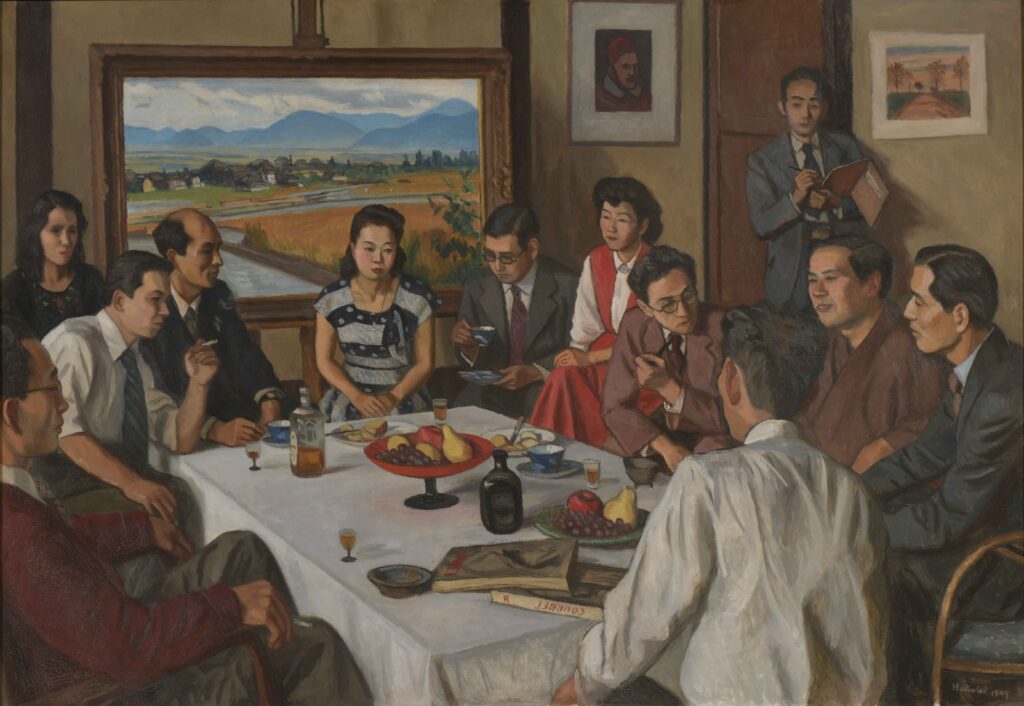 1945年3月、柏亭の姿は疎開先の松本にありました。東京大空襲により自宅とアトリエは全焼し、家財や作品など多くを失いますが、信州の雄大な自然に背を押され、絵筆を動かし続けます。さらに、若い画家たちへの指導や美術団体の結成にも力を注ぎ、戦後の信州美術の再興と発展に尽力しました。
